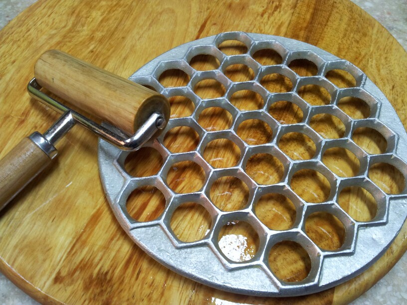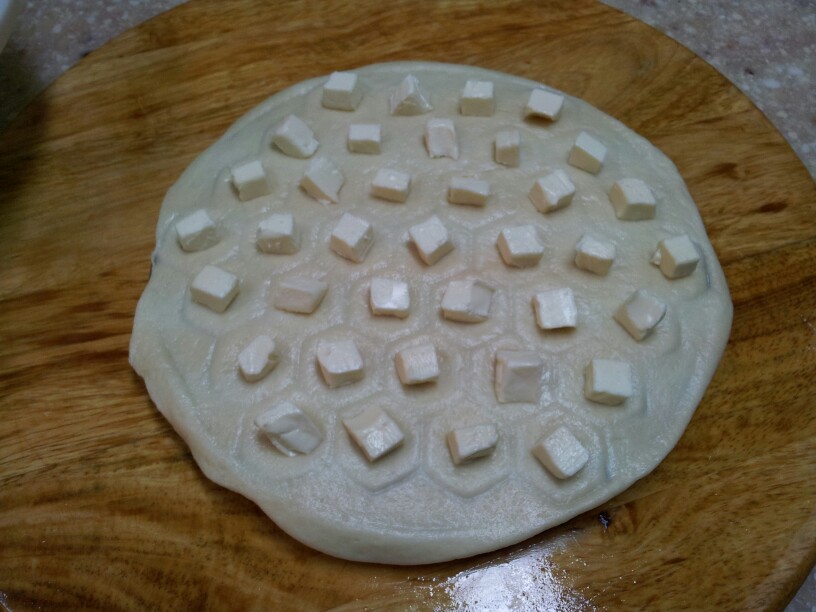 نفرد قطعه من العجين بحيث ما تكون سميكه جدا ولا رقيقه .. ثم نشيلها على الآله وننمرر المفرده عليها بخفه لحد ما تبان خطوط اآله .. ثم نضع عليها قطع الجبن .. بعدها نفرد قطعه اخرى من العجين ونغطي بها الأولى .. و الصور بتوصح أكثر ..