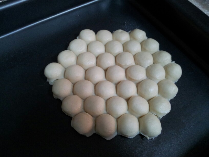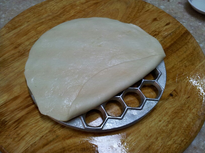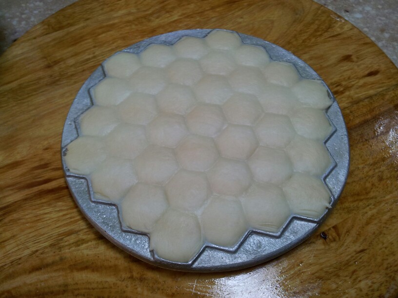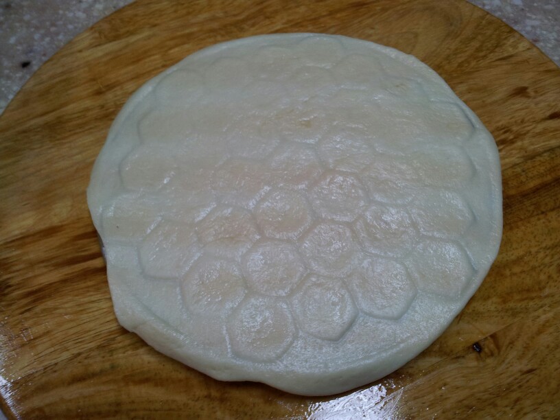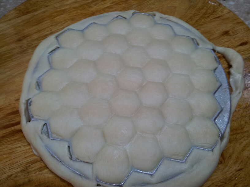 وبعد ما نغطيها بالعجين الثاني ...نمرر المفرده عليها مره ثانيه ولكن بشكل أقوى من الأوله .... ونضغط بها بقوه على الحواف الخارجيه للخليه علشان نتخلص من زوائد العجين .. اترككم مع الصووور ...