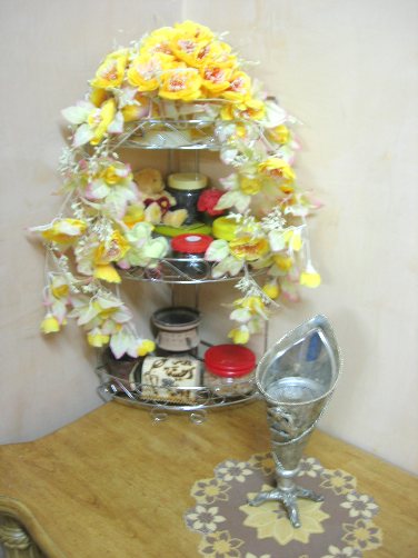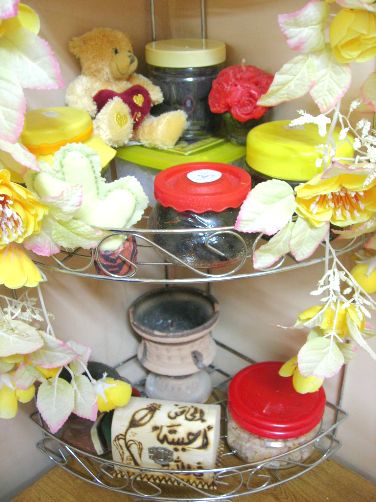 والحين بننتقل للطاولتين الجانبيتين يبت السلة الحديد بو طوابق و حطيت من فوق ورد عشان الشكل ههههههه وفي الطوابق الثانية حطيت اغراض البخور والمدخن ...