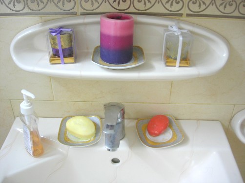 وهذي المغسلة حطيت فيها صابون خاصة بالوجه وصابون خاصة لليد وصابون سائل ... والصحن اللي تحت الصابون هو صحون كاسات الحليب ... انكسر الكاس وتم الصح ...