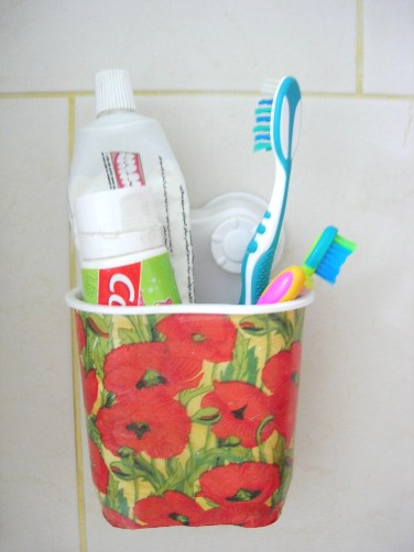 وبرع علقت حامل للفراشي الاسنان .. كان لونها ابيض بس انا عدلتها بورق مناديل ملون ..