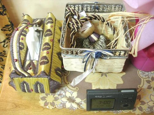 وحاطة بعد كرتون نعال حولته بالكلينيكس الملون لصندوق جميل حاطة في بعض الاشياء البسيطة لاستعمال اليومي
