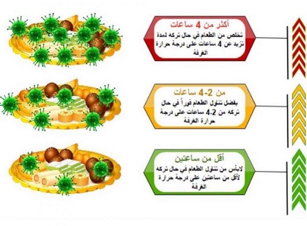 3- انتبهي فإن درجات الحرارة التي تتكاثر فيها البكتيريا بشدة تكون ما بين (5-60 درجة سيليزية) فحاولي الا تزيد فترة حفظ الأطعمة عن 4 ساعات على درجة حرارة الغرفة (23 درجة سيليزية).