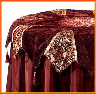 يمكن وضع مفرش طاولة بلون متداخل فيه العنابي مع الذهبي كلون كلاسيكي، أو حتى متداخل مع اللون الأخضر
