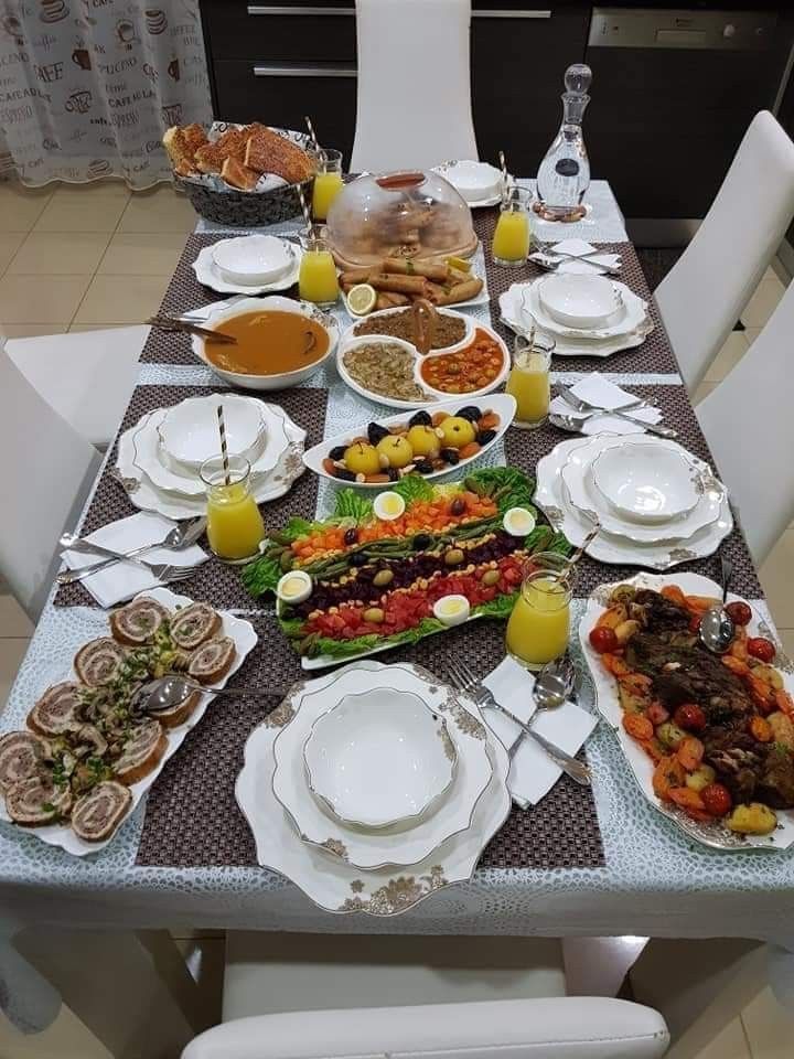 والطبق التاني وحتى الثالت على حسب وأغلبها لحم وخضر من الأطباق التقليديه والعصريه وكل واحد ومقدوره