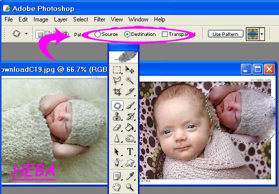 اما الاداة الثانية ( الترقيع ) فشوفي شريط الادوات المعلم وخلي شريطك زيه
