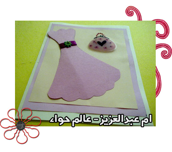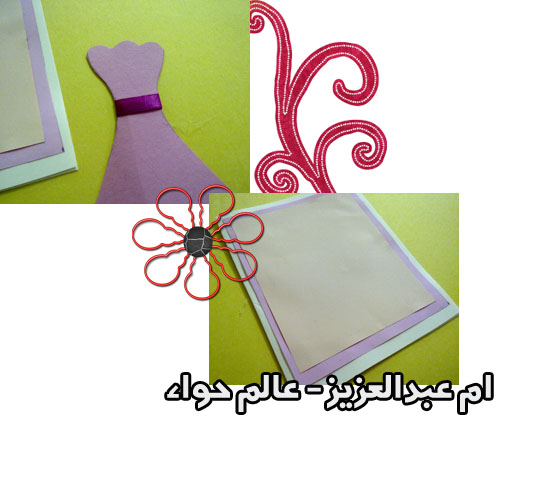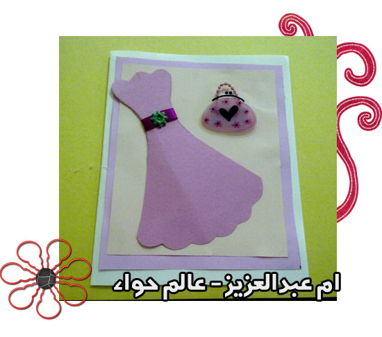 ونلصق الفستان على الكرت وزينته بستيكر ورده خضراء على الشريطه
