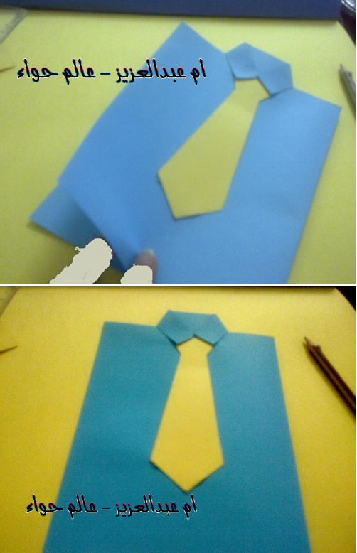 نثني الجهه العلياء بشكل مثلث لنحصل على ياقه للقميص ونصمغ اطرافها