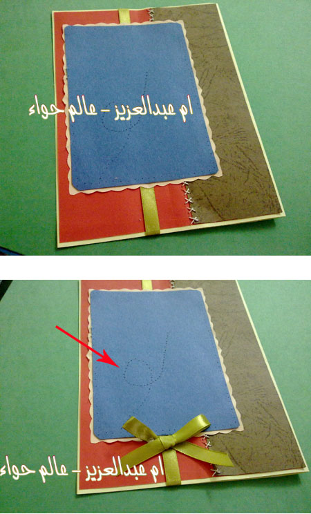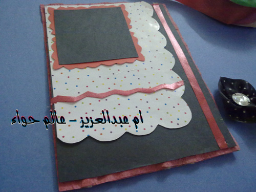 وهذي هي النتيجه نجيب ورقه التغليف الحمراء ونلصق عليها الورقه السوداء ثم نلصق عليها الورقه البيضاء المنقطه بعد قص اطرافها ونجيب الورقه الحمراء الصغيره ونطويها طيتين ثم نرسم عليها هذا الشكل ونقصها لنحصل على ورقه مزينه الاطراف ونلصقها على الكرت هذه الصورة تم تحجيمها. اضغط على الشريط لمعاينة الصورة بالحجم الكامل. ابعاد الصورة الاصلية 584x498 و بحجم 111KB. ونلصق فوقها ورقه سوداء ونجيب الشريطه الورق ونقصها لنحصل على شريطه دقيقه ونلصقها على جنب الكرت وبنفس الطريقه لكن قصيتها بشكل مثلثات صغيره والصقتها على الكرتوهذي هي النتيجه نجيب ورقه التغليف الحمراء ونلصق عليها الورقه السوداء ثم نلصق عليها الورقه...