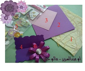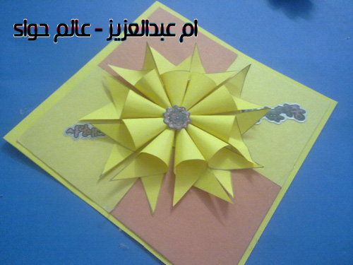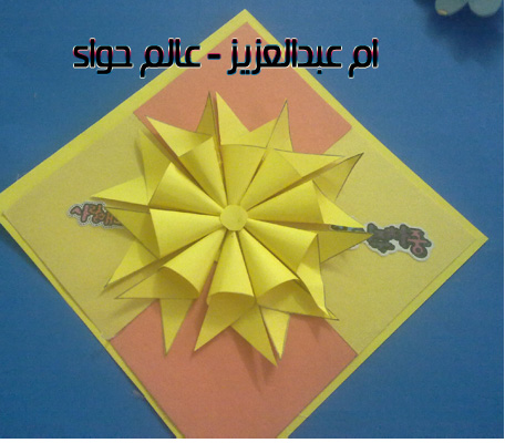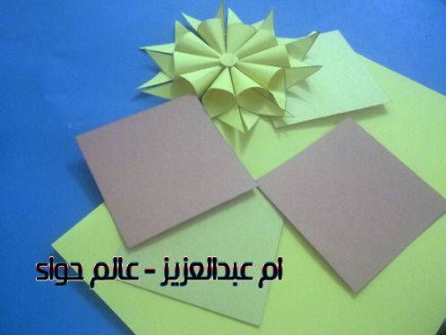 نلصق المربعات على ورقه الكرت ثم نلصق فوقهم الورده