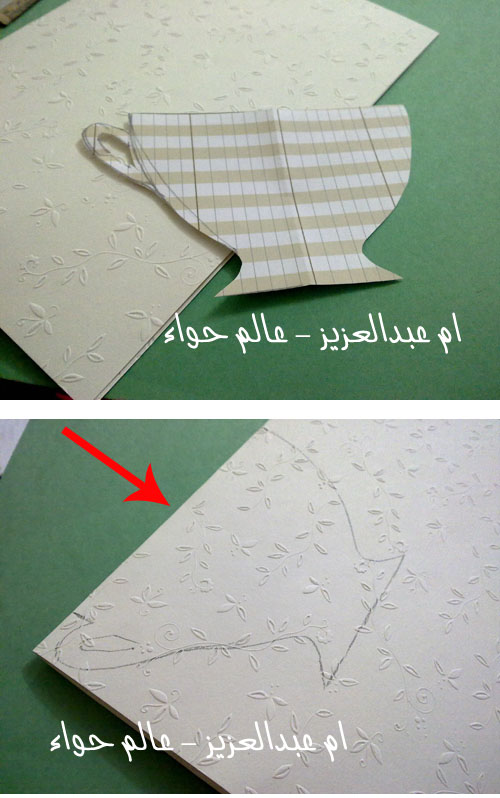 ثم جبت ورقه الكرت وطويتها من المنتصف ورسمت الكوب في الثنيه