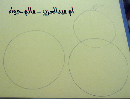 اولا نرسم دائره صغيره ودائره كبيره متداخلتين في بعض شوي في ورقه صفراء