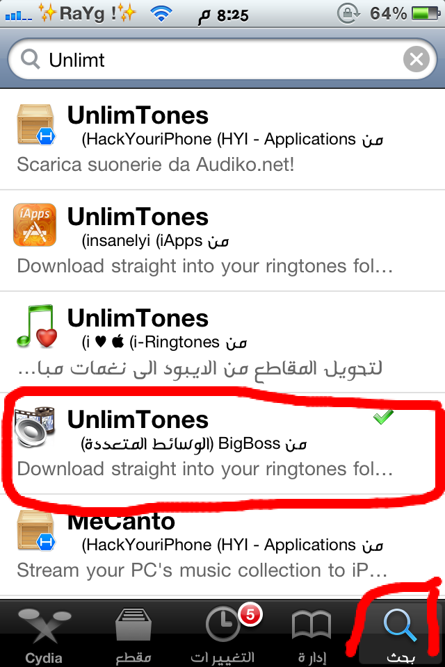 التحميل من السيديا يعني لازم جلبريك سوي بحث بالسيديا وتطلع لك الأداة. الدخول على السيديا Cydia ثم Search أكتبي UnlimTones وهذا شكله في السيديا سوي تثبيت وتجدين البرنامج كأي برنامج على السطح في الأيفون.التحميل من السيديا يعني لازم جلبريك سوي بحث بالسيديا وتطلع لك الأداة. الدخول على السيديا Cydia ثم...