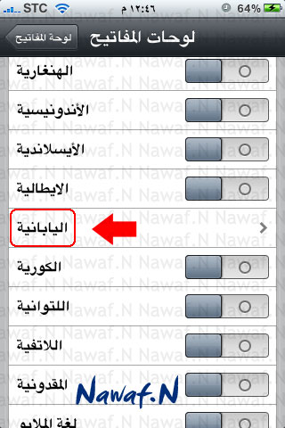 الحين نروحين ( الاعدادات -->> عام -->> لوحة المفاتيح -->> اخر خيار-->> نبحث عن اللغة اليابانية )