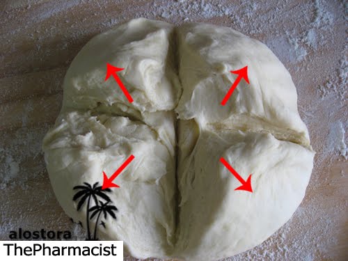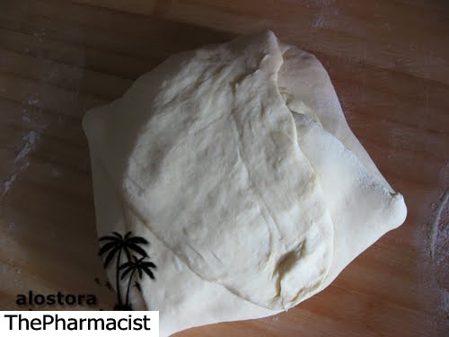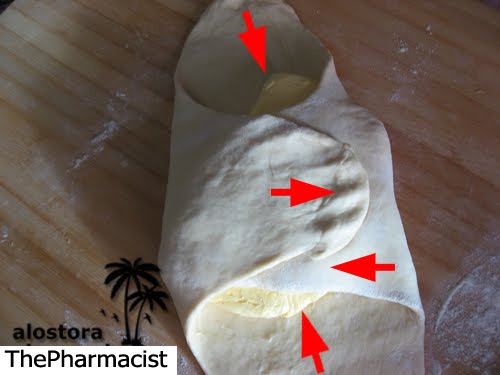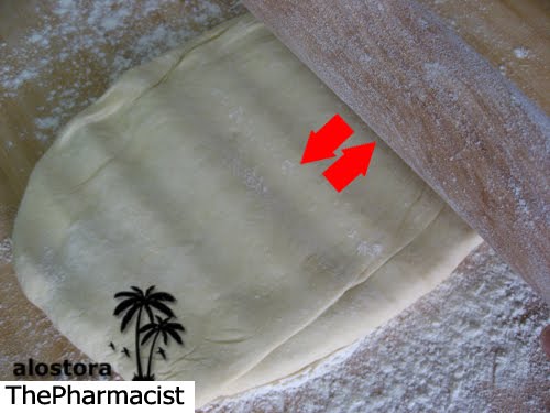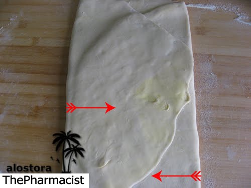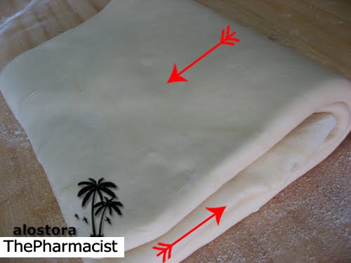 نطوي العجينة كما بالشكل ..ثم نطويها مرة اخرى بعكس الاتجاه السابق..(من اعلى واسفل )