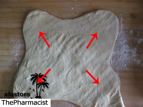 نسحب زوايا العجينة للخارج ونرقها بالشوبك قليلا حتى تنبسط كما بالشكل..(كالفراشة)