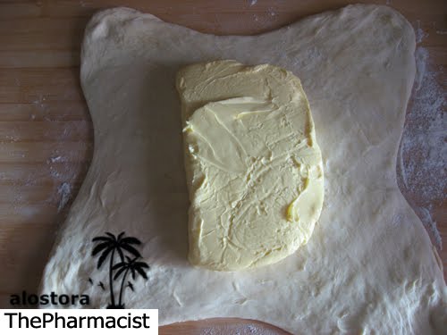 نضع الزبدة اللي حضرناها بوسط العجينة ثم نسحب اطراف العجينة