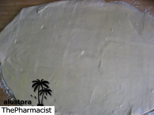 نخرج العجينة ونضعها على سطح مرشوش بالطحين