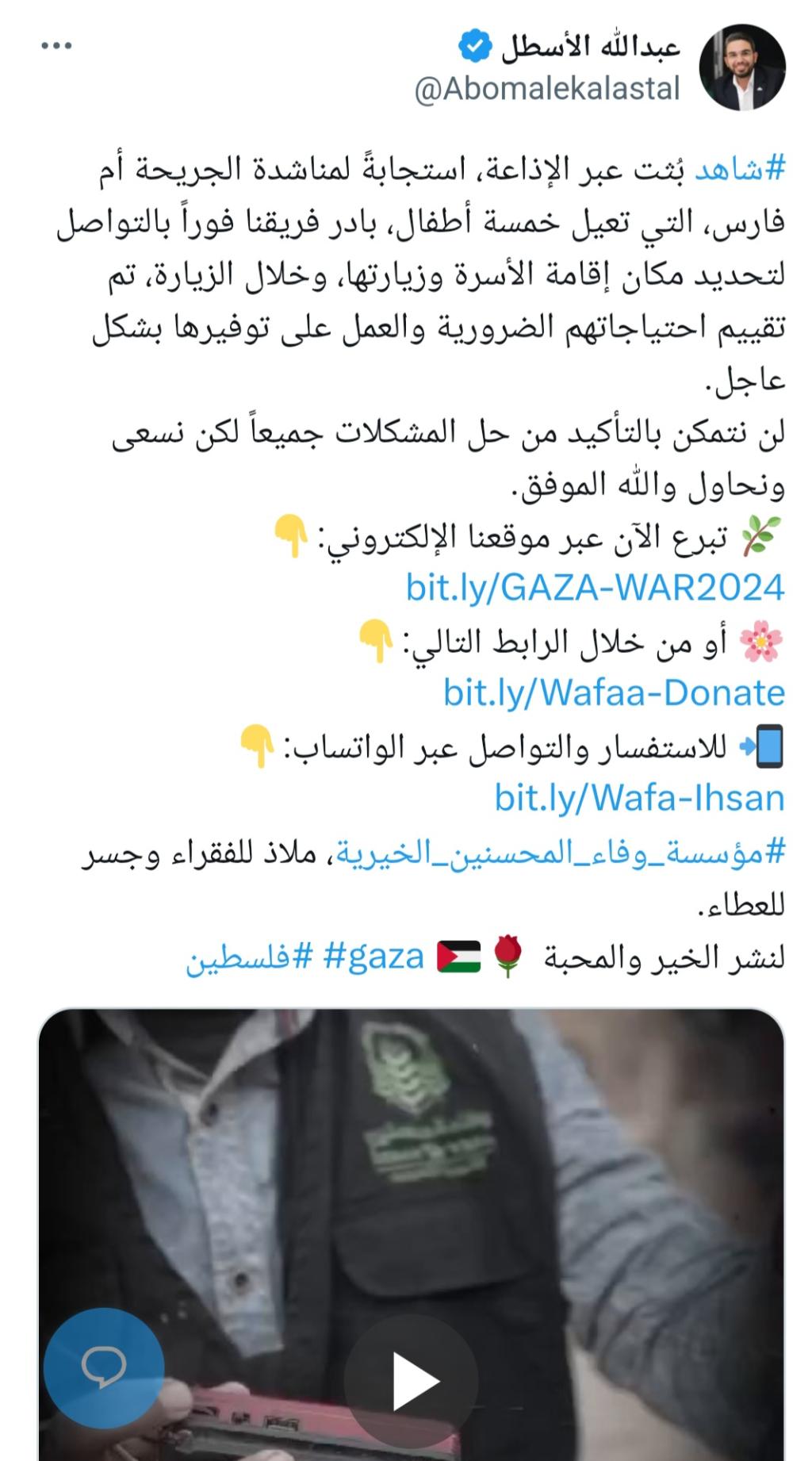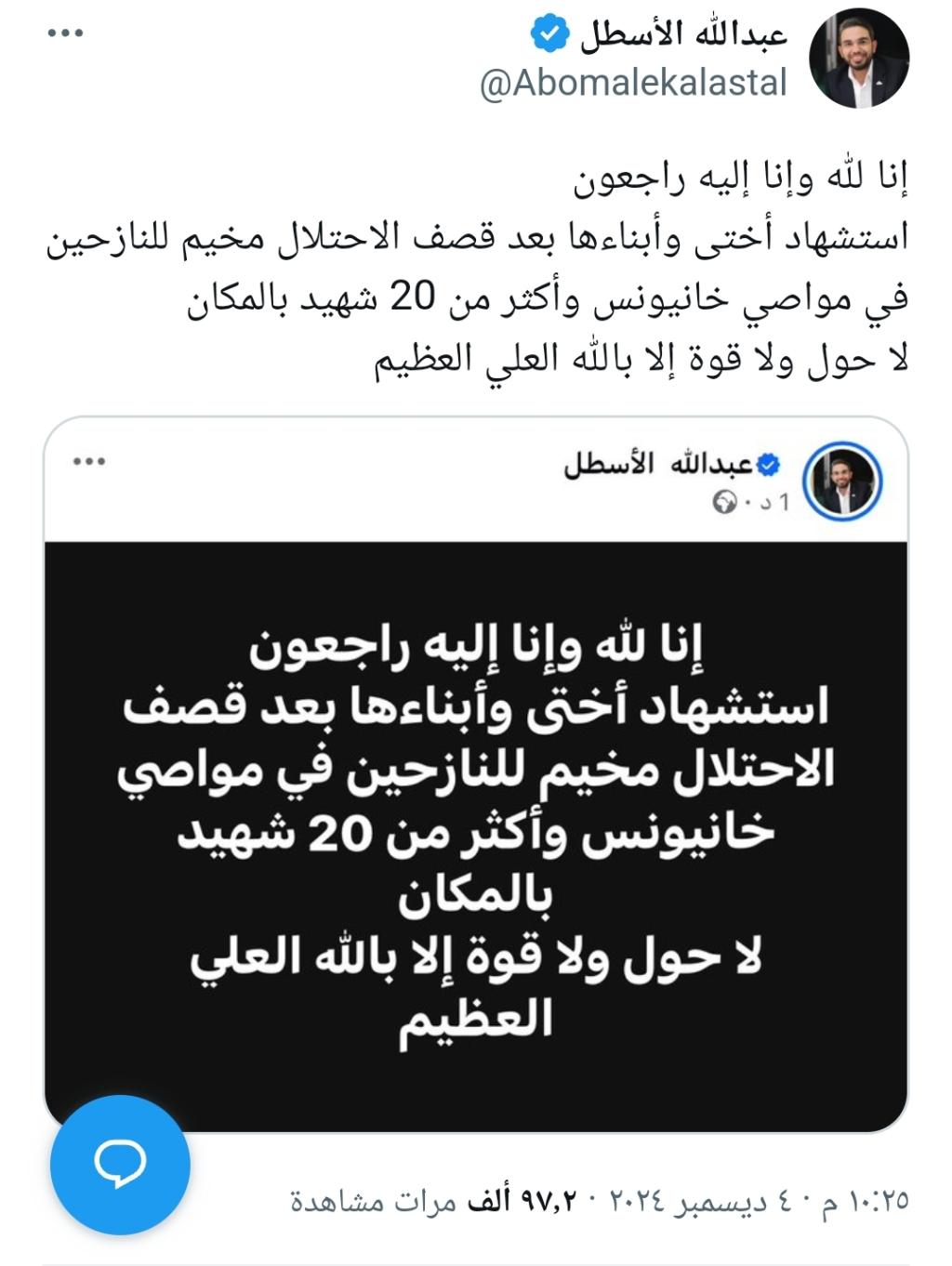 بالأمس القريب وصلني خبر وفاة أخت أخينا الأستاذ عبدالله الأسطل رئيس جمعية وفاء المحسنين الخيرية في غزة رحمهم الله في مخيم المواصي بخان يونس💔 والذي يُفترض أنها مناطق إنسانية مدعومة من العالم🤷🏻♀️😭💔 ... والأستاذ عبدالله يعرفه أغلب أهل عمان لأنه على تواصل وثيق بحملات التبرع فيها لغزة من سنين طويلة عن طريقه وجمعيته الموثوقة👍🏻... وكم هو محزن ومؤلم أن نرى بالأمس الأخ عبدالله ينعى أخته وأبنائها كحال بقية أهل غزة الذين ما في قلوبهم من جروح الفقد💔 والخذلان الكبير💔 صعبة الشفاء ولا يعلمها ويداويها إلا الله😭🤍...