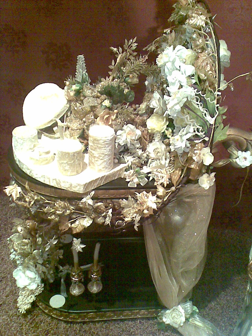 مجموعة من العطور ،،، ساعة ( حسب شكل العربية إذا ذهبية او فضية او حسب الصحون والتحف اللي فيها لو كانت خشبية )
