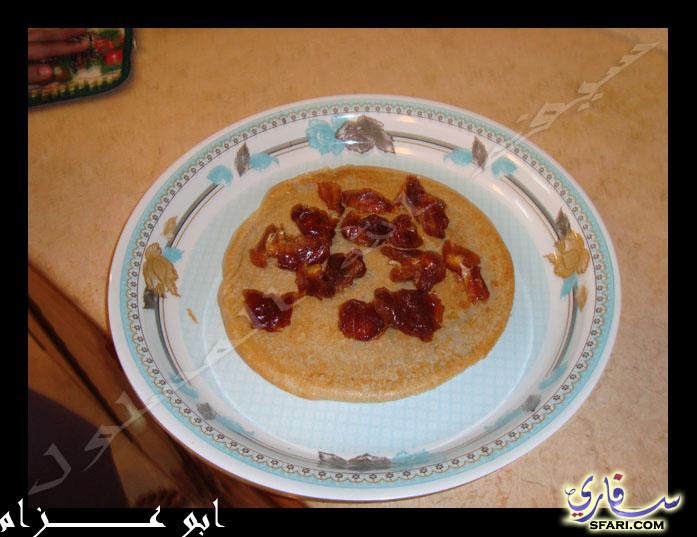 اقلبوا قرص العجينه في الصحن وضعوا عليه التمر ونصف كمية السمن..