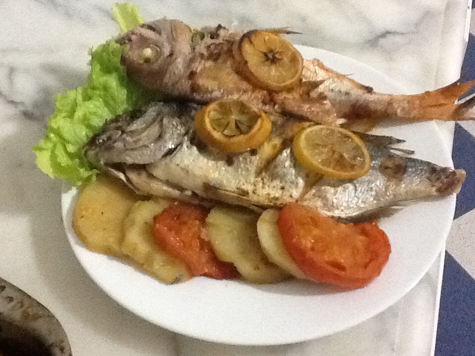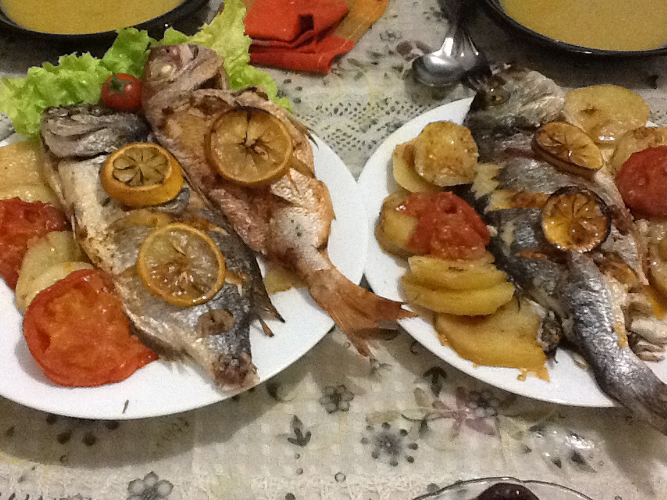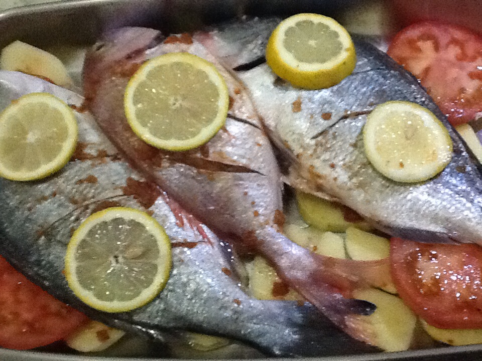 اولا نقطع البطاطا والطماطم نتبلهم ثم نحط السمك ونحط فوقو الليمون والزيت