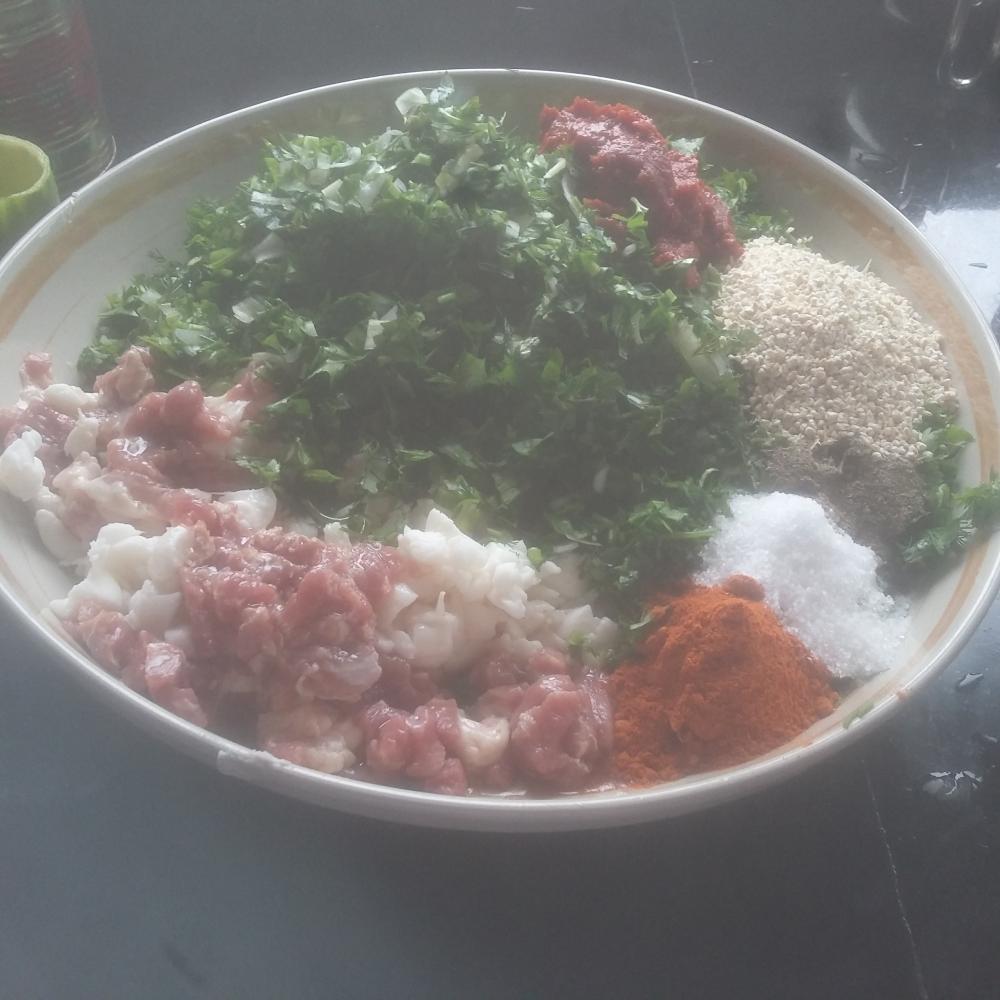 كبدة و لحم و لية مقطعة مكعبات أرز مصري كوب ( لأن زوجي عنده السكر فاستبدلت الرز بالدشيشة و هيا شعير مجروش )