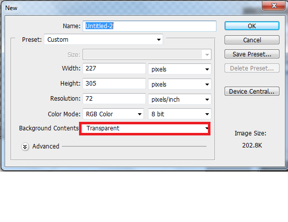 لما تفتحي عمل جديد new اختاري الخيار transparent