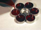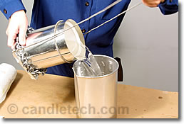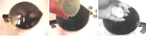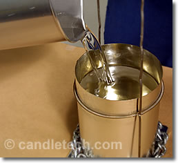 8 - بعد أن تجمد حواف الثقوب ، يعاد تسخين الشمع المتبقي لدرجة حرارة متوسطة ، ثم يصب في الثقوب ، بعدها تترد الشمعة لتجمد كلياً.