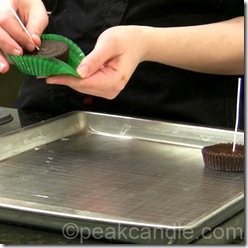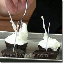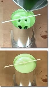- يتم ربط الفتيل فى قلم أو بنسة شعر أو خشبة صغيرة او حتى اسياخ الشيش طاووك ...ألخ ويتم وضعه على فوهة القالب ويسقط الخيط فى منتصف القالب ( لما تكون الفتلة مغموسة فى الشمعه بتنشف وتبقى سهلة تتظبط فى النص ) زى كدة