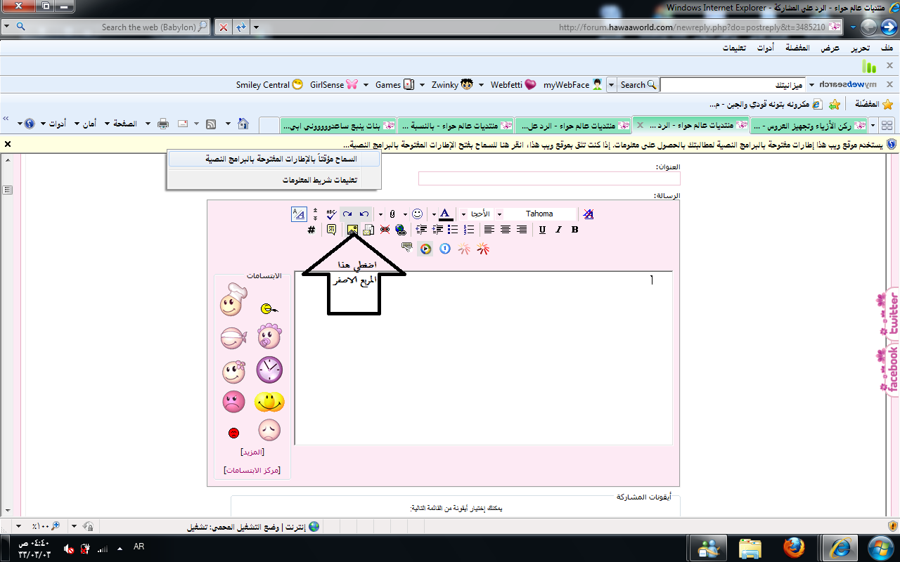 ويطلع لك ششريط اصفر فوق بالصفحه اضغطي عليه وحطي سماح......الخ
