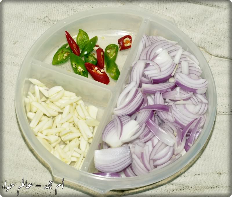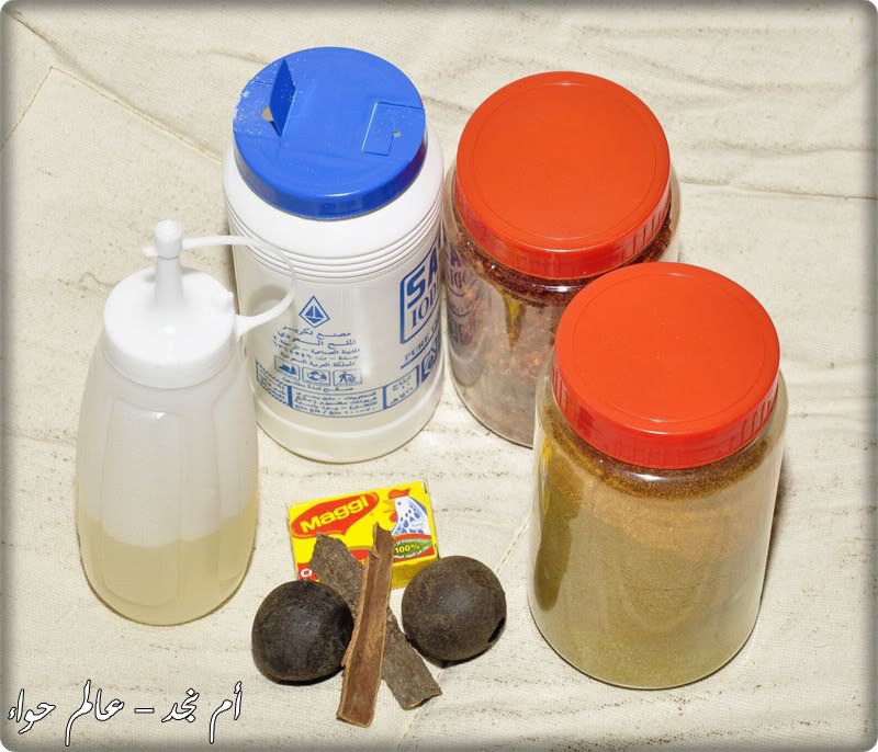 فوقه شوية كركم وحبات هيل وفلفل اسود حب وبودرة وكزبرة حب وزعتر بودرة وحبة فلفل اخضر حار
