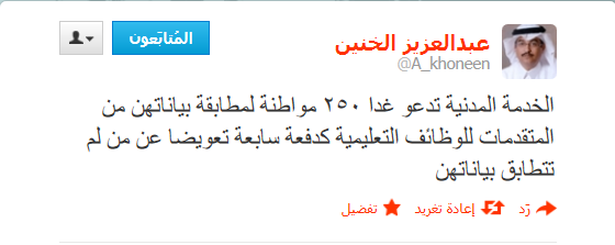 الخدمة المدنية تعلن غدا اسماء ٢٥٣ مواطنة من المتقدمات للوظائف التعليمة اجتزن المطابقة لاستكمال اجراءات المقابلة بالتربية والتعليم