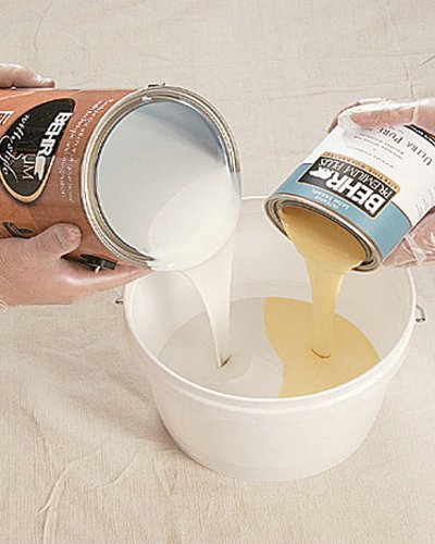 نخلط في سطل اللونين المراد دهنهما بعد ذلك يتم خلطه بالعصا حتى يمتزج اللونان