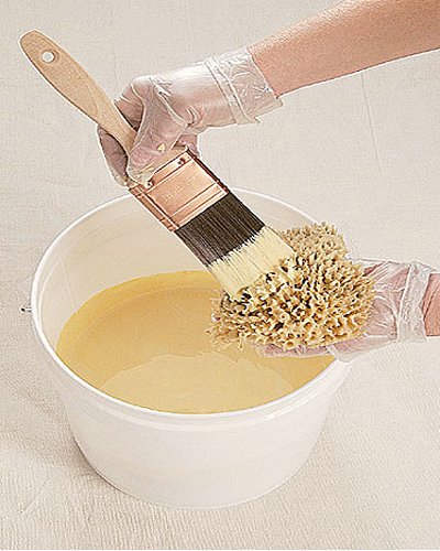 نبلل الأسفنج بالماء ثم يدهن عليه الدهان..