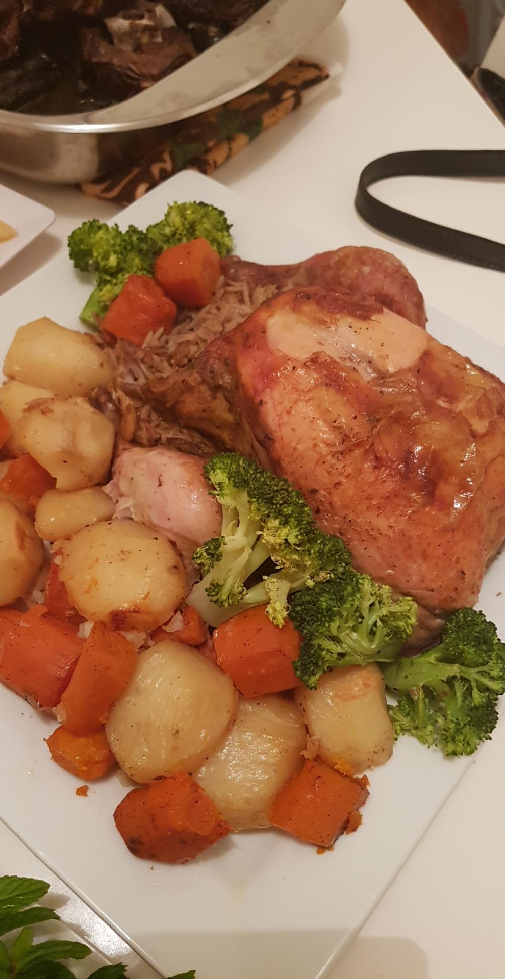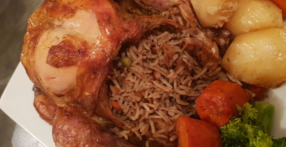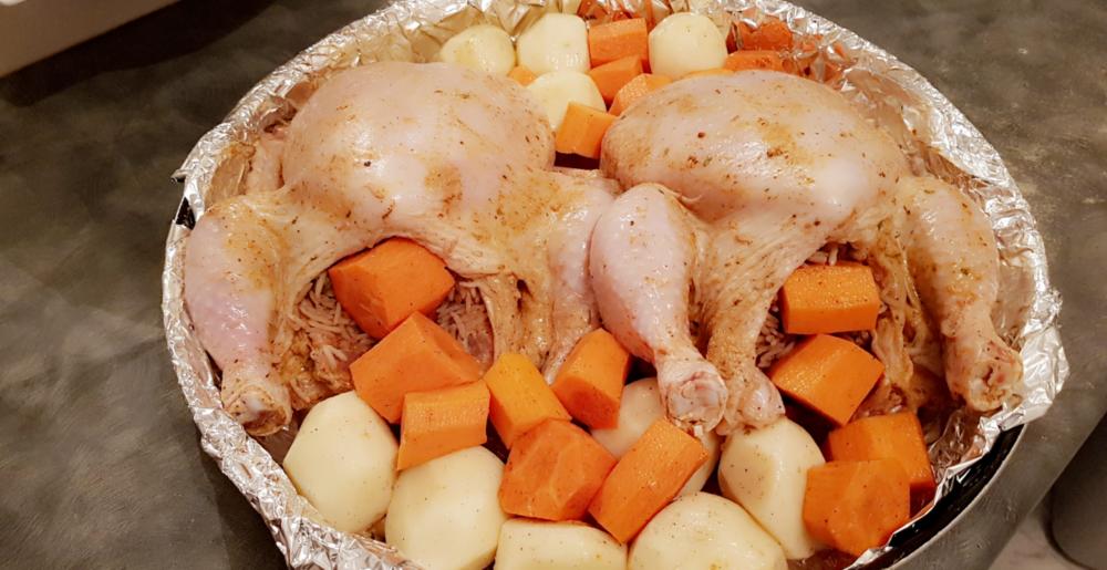 بس يكون الرز ستوا احشي الفروج بالرز وفيكي تحطي بالصينية خضرة متل ما انا عملت حطيت بطاطا وجزر وبروكلي مع الفروج غطي الفروج بالقصدير ودخليون الفرن وتركيه يستوي عرياحتو وبس يستوي طلعيه وسكبيه بصحن التقديم وصحة وهنا