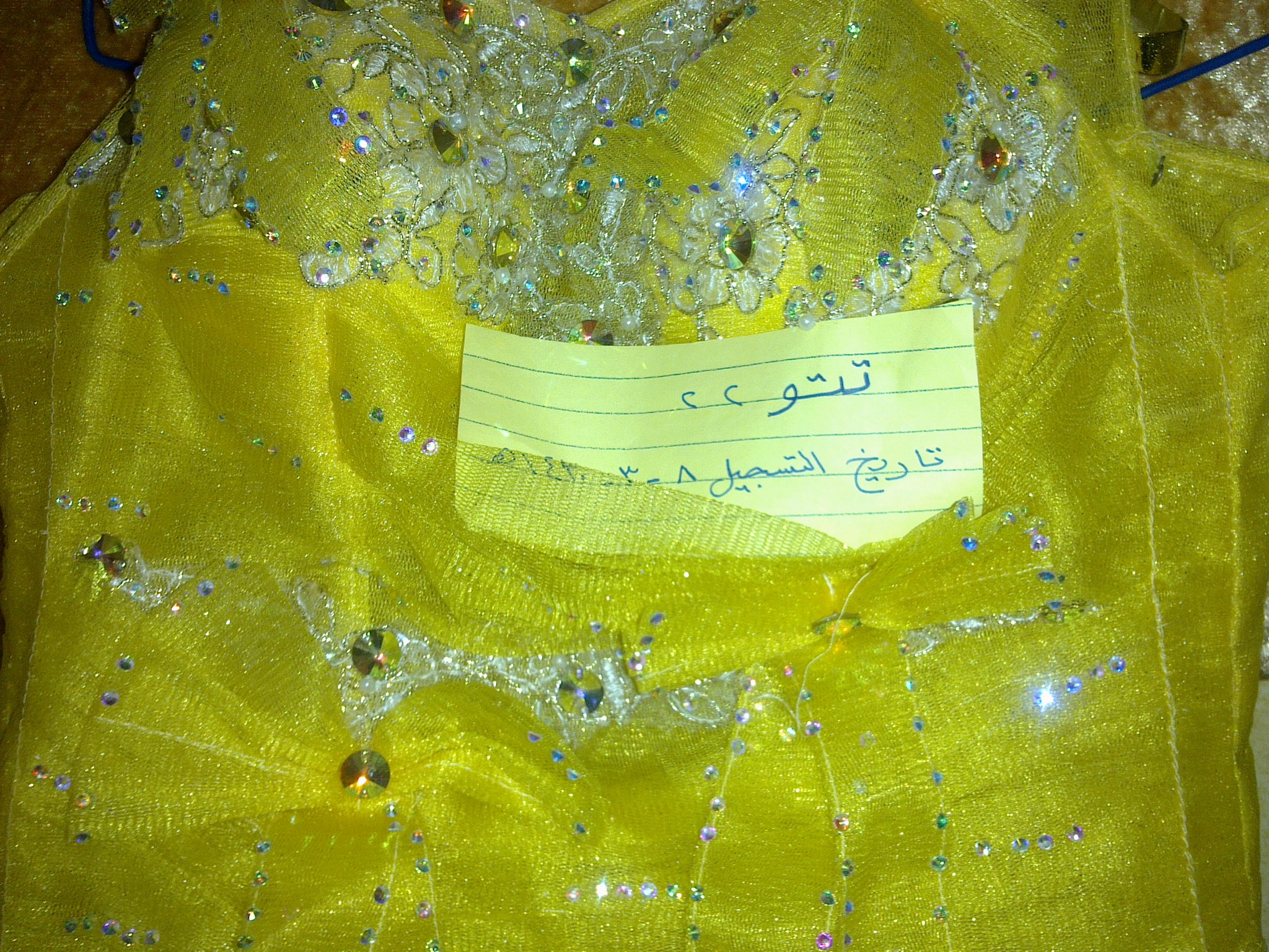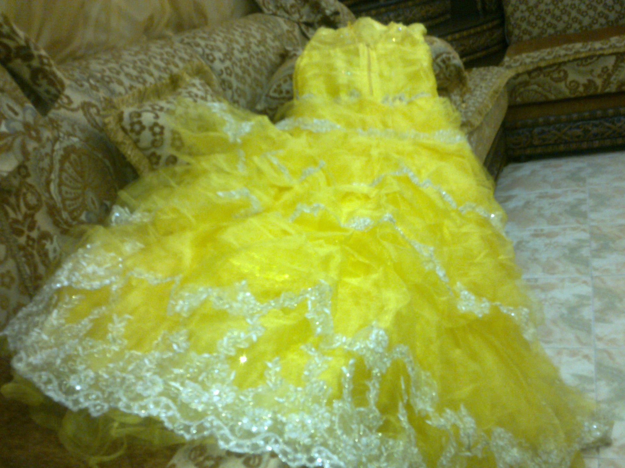 الفستان الثاني فستان ملكه لونه اصفر ماسك الى الخصر بعدين يجيك منفوش وطبقات معاه طرحته مقاسه مديم يعني يلبس تقريبا وزن 54 كيلو