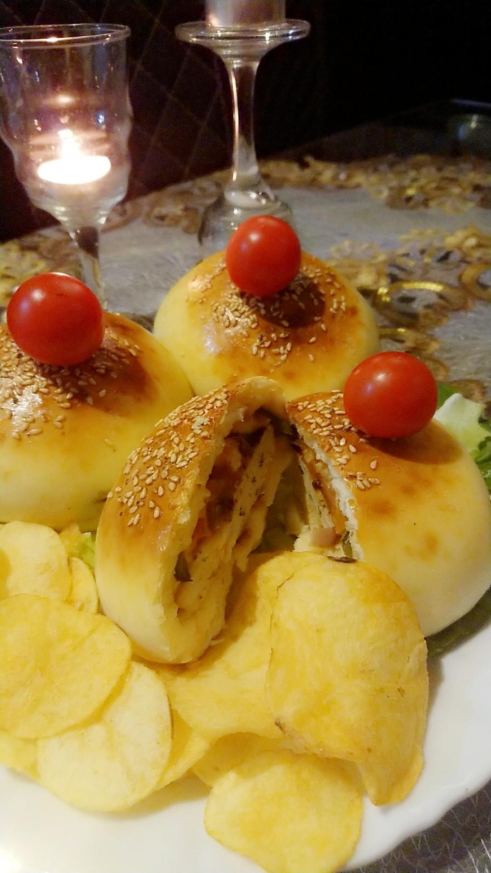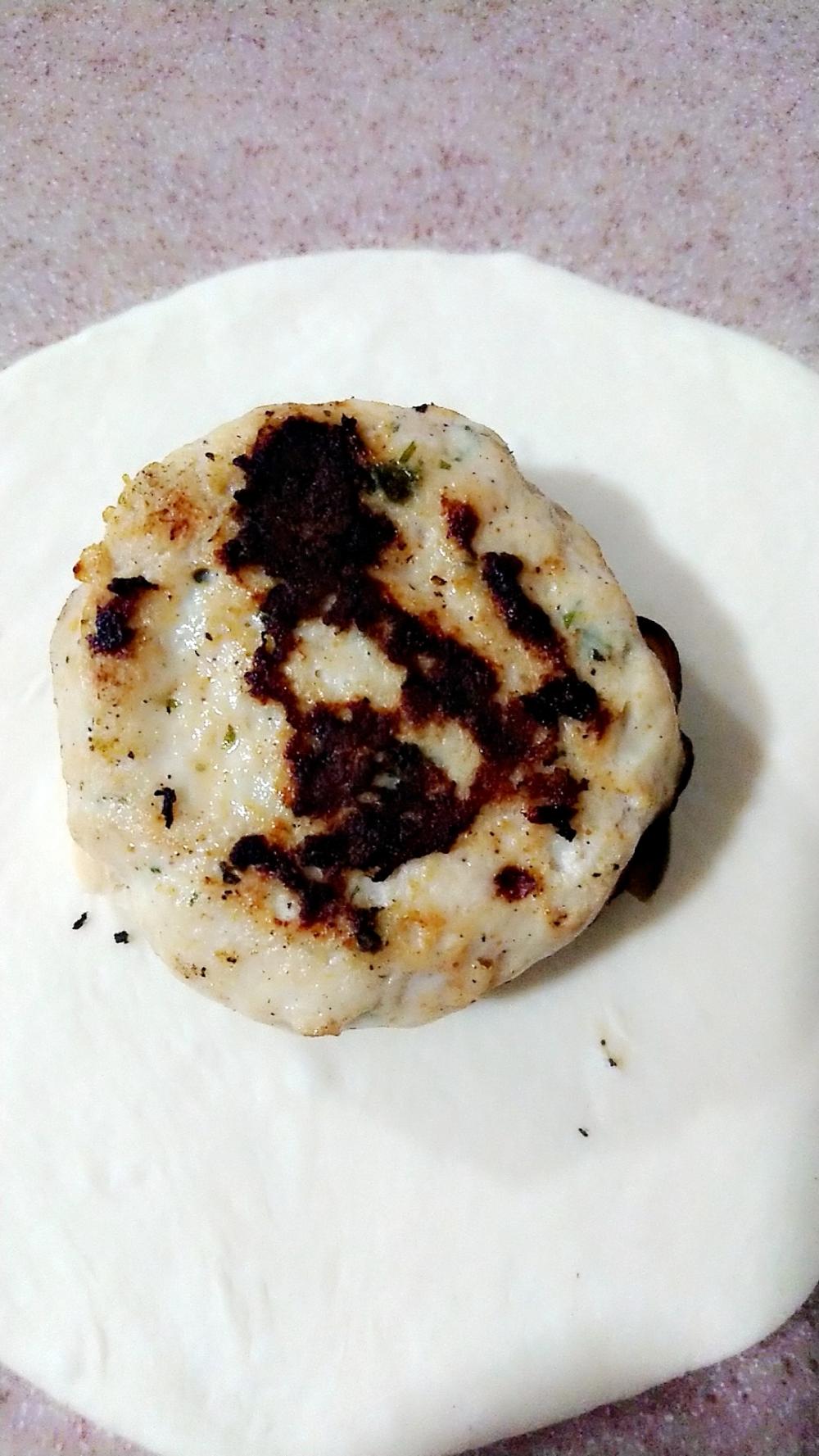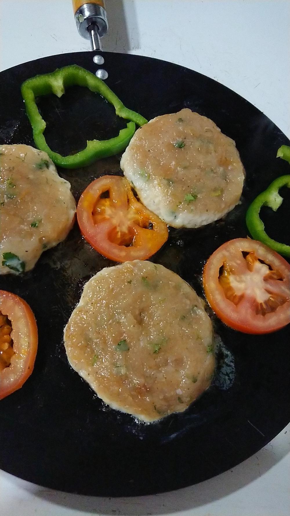 وشكلتها اقراص وشويتها مع حلقات فلفل بارد وطماطم