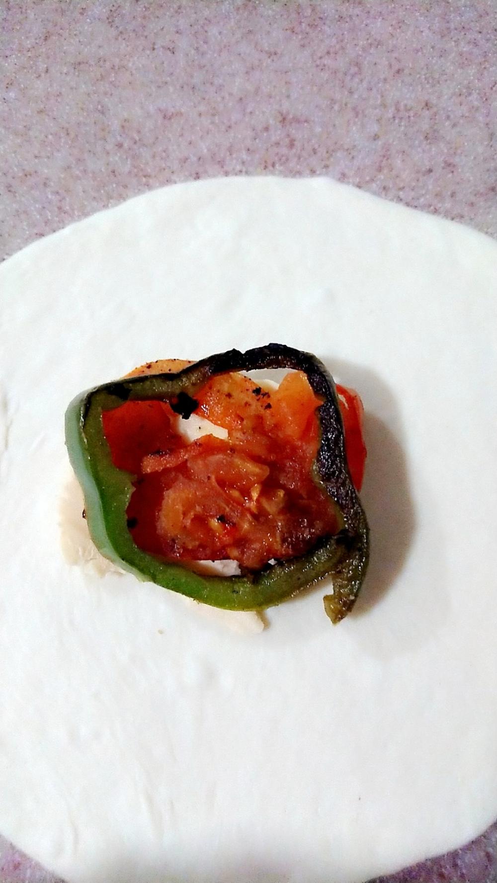 وبعدين حطيت جبن شرائح وبعدها الطماطم وشرائح الفلفل البارد