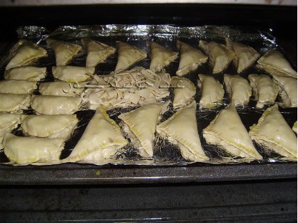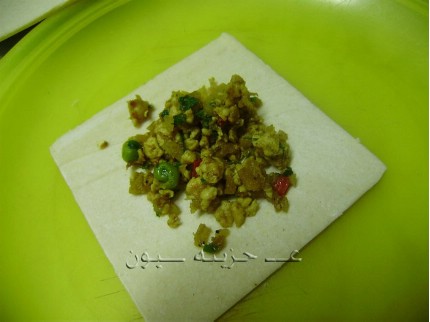 نفكك مربعات البف عن بعض ونتركها تفك شوي على صينية - - ندهن البف بشوي جبن