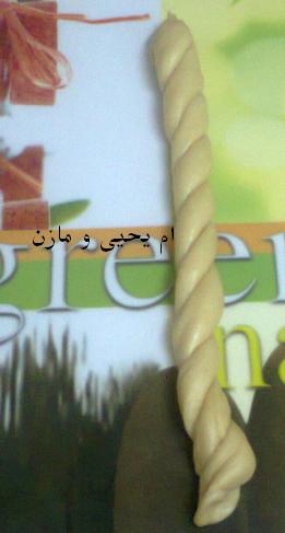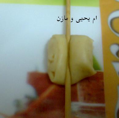 ** هناخد كل قطعة و بواسة عصاية الشوى الخشبية نضغط فى منتصف قطعة العجين بالشكل ده و نلزق الطرفين الاتنين بتوعها فى بعض بالشكل ده