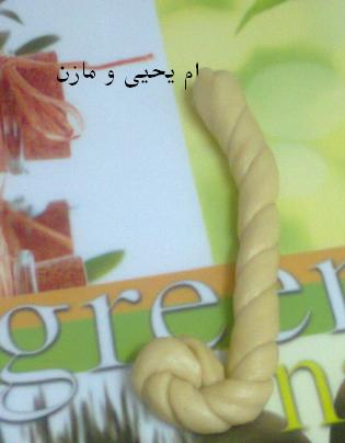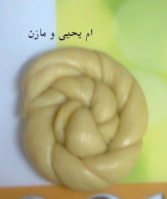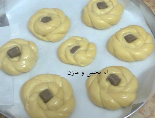 .و ممكن تمسحى عليها بالفرشاه بالسيرب او شربات عشان تديكى لمعه حلوة و دا طبعا بعد ما تستوى..و بعدين احط شوية مربى بفضل فروالة فى وسط كل وردة و تكون بالشكل الجميل ده ثانيا: ضفائر الشيكولاتة او وردات الشيكولاته ****************************** النص التانى من العجينة .. قسمته 6 كور ..و كل كورة بفردها حبل طويل و بتنى الحبل ده من النص مكونه طرفين و اضفرهم فى بعض بالشكل ده