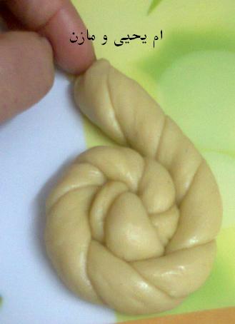 و بعدين الف الضفيرة حول نفسها بالشكل دة و احط فى النص قطعة شيكولاته و اسيبها تخمر نص ساعة او ساعة حسب الجو و بعدين ادهن و شها بالبيض و الحليب و ادخلها الفرن