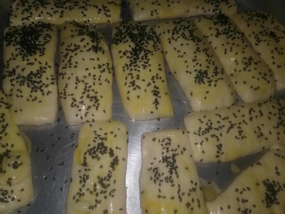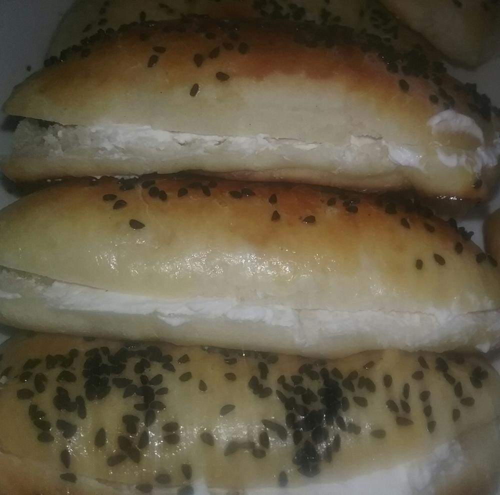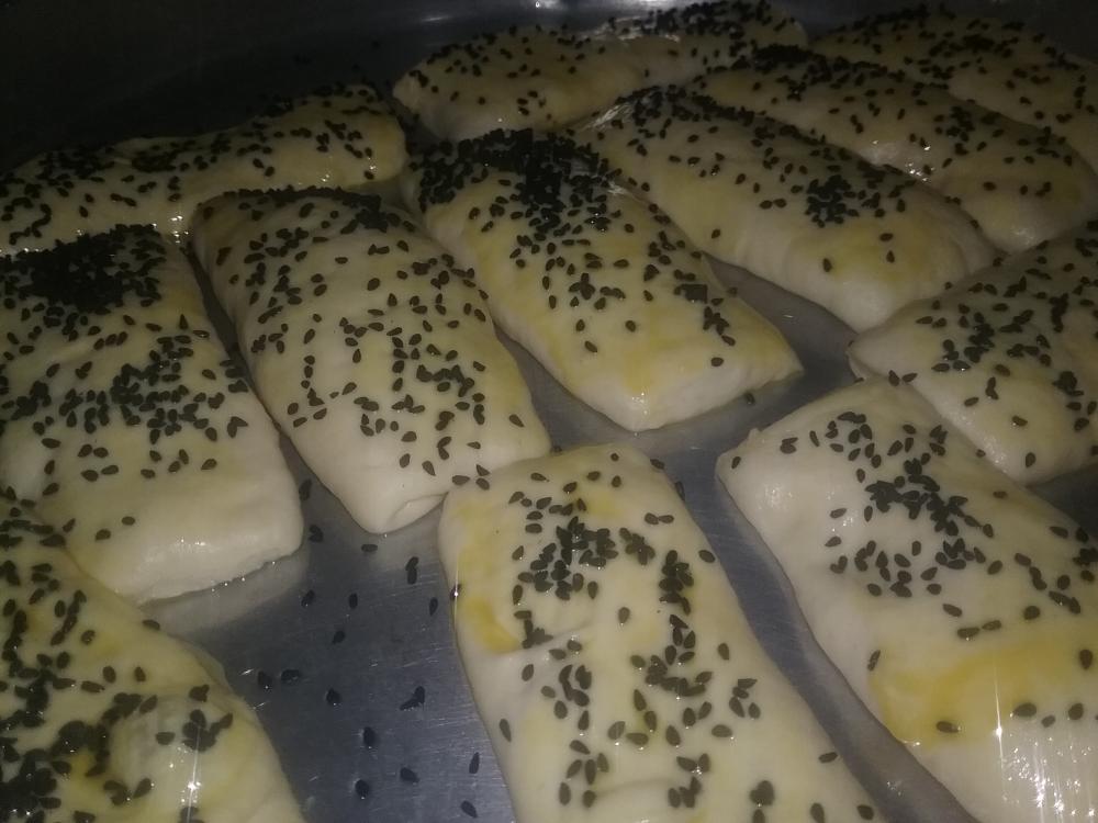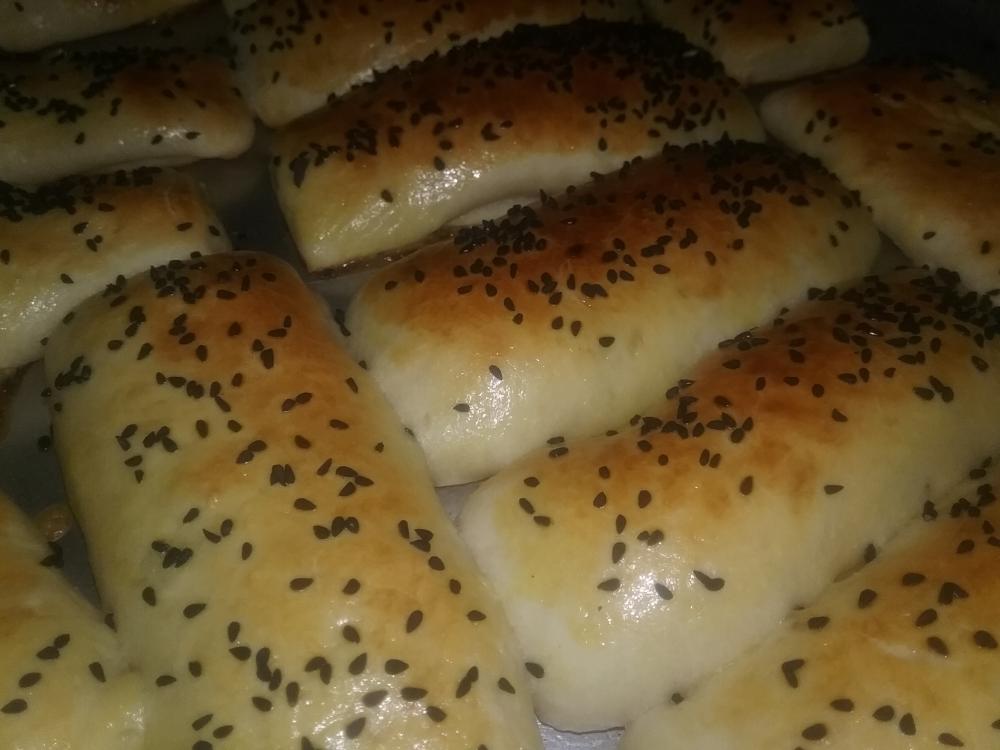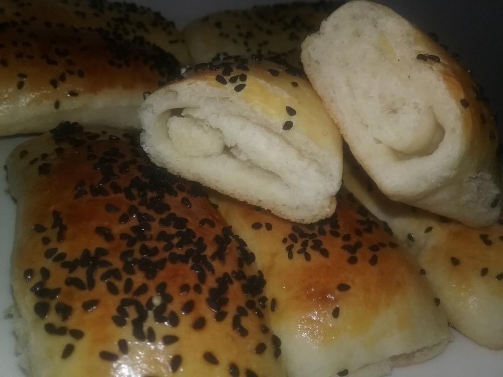 نصب الماء ونحط له الخميره والسكر وننتظرخمس دقايق ثم نضيف الملح والزبادي والزيت ونخلط بالمشبك اليدوي ثم نضيف الدقيق ونعجن.لما تكون العجينه ماتلتصق باليد وخليتها تخمر نص ساعه ثم قطعتهم دوائر وفرد ت الواحده بشكل مربع ولفيتهم بشكل رول وغلقت الاطراف بيدي ودهنتهم بصفار بيض ورشيت سمسم او حبه البركه ودخلتهم فرن حار من تحت ثم فوق بعدما خرجتهم فكيتهم بالمقص والبعض حشيته جبنه وبعضهم نوتيلا