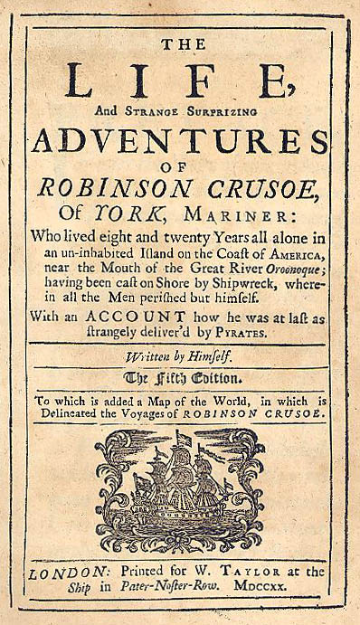 “The Life and Strange Surprising Adventures of Robinson Crusoe of York, Mariner: who lived Eight and Twenty Years, all alone in an un-inhabited Island on the coast of America, near the Mouth of the Great River of Oroonoque; Having been cast on Shore by Shipwreck, wherein all the Men perished but himself. With An Account how he was at last as strangely deliver’d by Pirates. Written by Himself.”