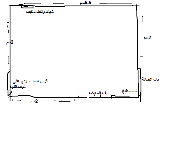 معليش الرسمة ملخبطة سامحيني شوفي حبيبتي الجدارين اللي مقابلين بعض حق باب الصالة والقوس انا كتبت 2 سم يعني مسافة الجدر بدون الباب والجدر كامل مسافته 3 ونص