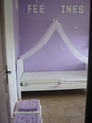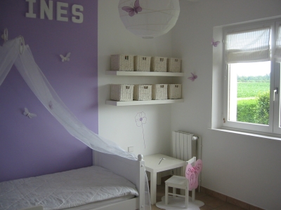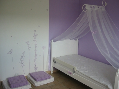 شوفي مخلين الجدار الابيض فيه رسمات ناعمة وبسيطة بالبنفسجي .. والاثاث ابيض ناعم مافيه تكلفة .. والستارة اللي فوق السرير شي مميز احبه يكون في غرف البنات
