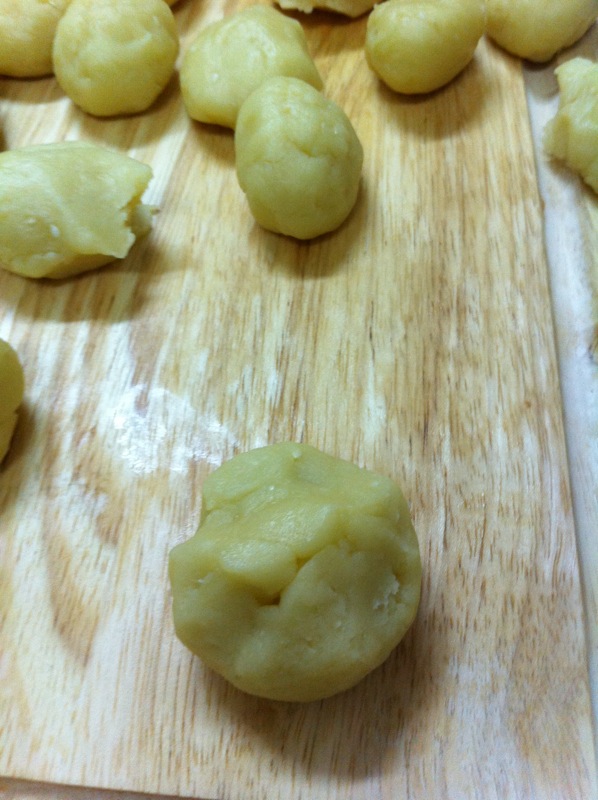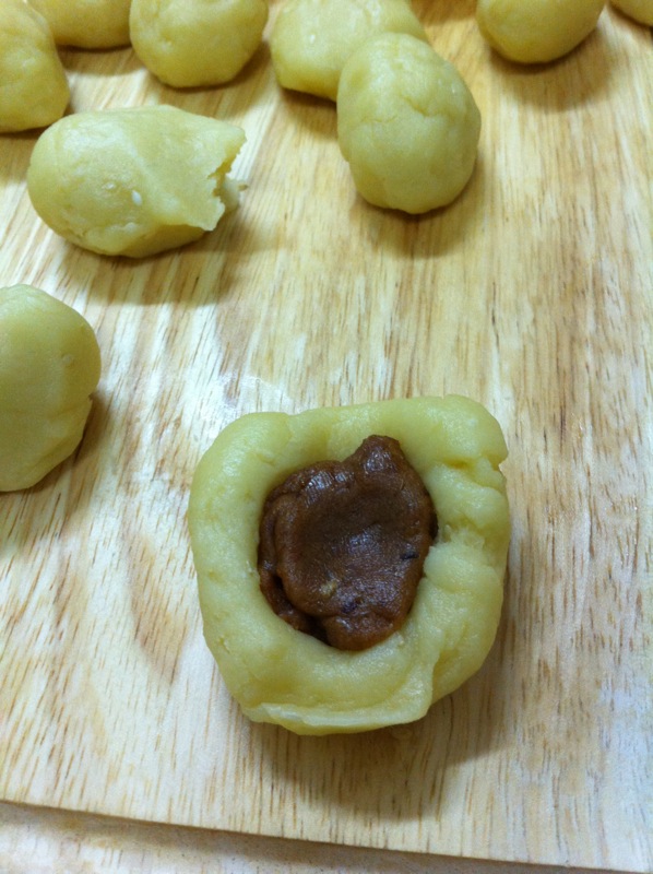 يقطع بحجم الليمون ونضع التمر ف الوسط