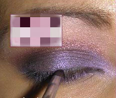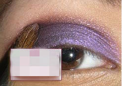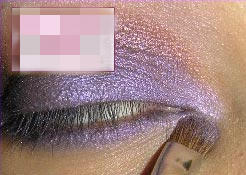 3- أنشري الظل البنفسجي القوي ( يجب أن يكون اللون بارز) على كامل الجفن المتحرك حتى منتصف العين ثم ضعي اللون الوردي بين الأبيض و البنفسجي مباشرة في الخط الفاصل بين الجفنين بضربات حتى يمتزج تماما مع اللونين ويظهر تأثير تدرج الألوان.