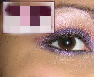 4- أسفل العين وبواسطة فرشاة رفيعة بللت بالماء أولا ضعي نفس اللون البنفسجي السابق بخط يمتد من الزاوية الداخلية للعين حتى الخارج ثم كحلي عينيك من أعلى ومن أسفل بقلم الكحل السائل الأسود ثم كحلي داخل العين بالكحل الأسود القلم الجاف.